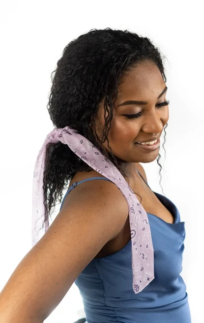 The Knotty – Riding Into the Sunset is a new take on a classic bandana print. Lilac, light, and unique, with a long flowing scarf, this Dew is like a perfect end to a perfect day.