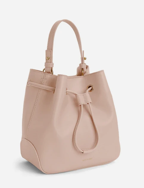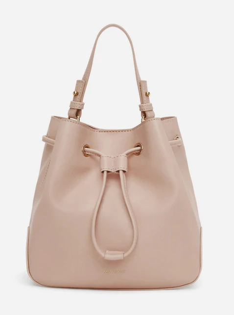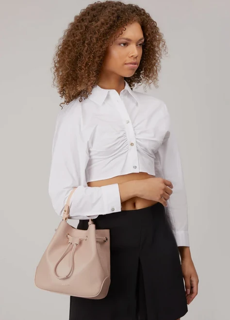 Bucket bag with drawstring and inner magnetic snap closure, removable top handle, and a detachable and adjustable crossbody strap.