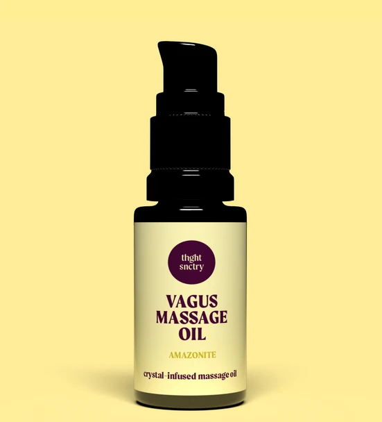 VAGUS oil is infused with amazonite and a balanced blend of plant essences designed to help tone the vagus nerve. The vagus nerve is the longest cranial nerve in the body that connects the brain and gut. Toning the vagus nerve can help improve the body’s stress response and encourage happy feelings.