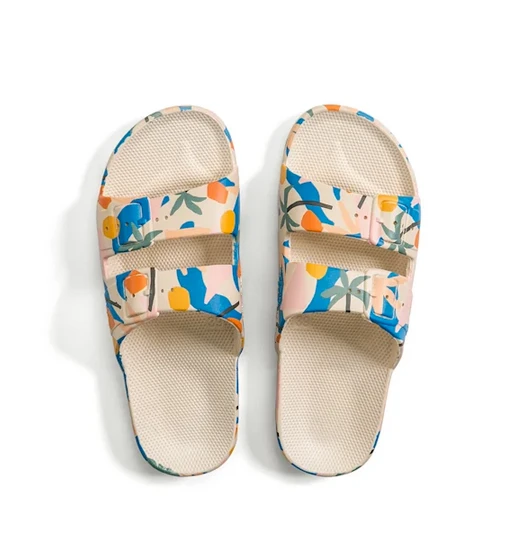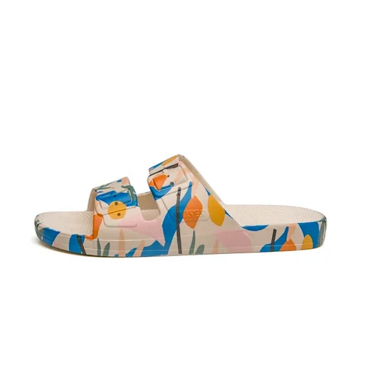 At Freedom Moses we’re all about celebrating summer 365 days a year. From am to pm, our PALMETTO STONE vegan slides are injected with air so you feel like you’re walking on a cloud. Whether chilling at the beach or just hanging out, we’re also available for your whole crew, from kids slides to women’s slides and men’s slides, if you’re into prints, glitters, metallics or basic colors we’ve got you covered.