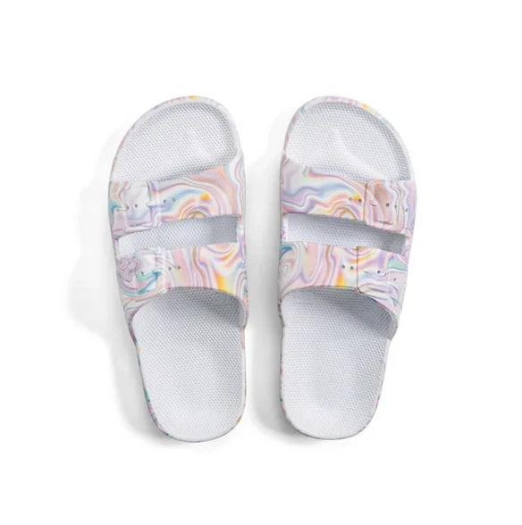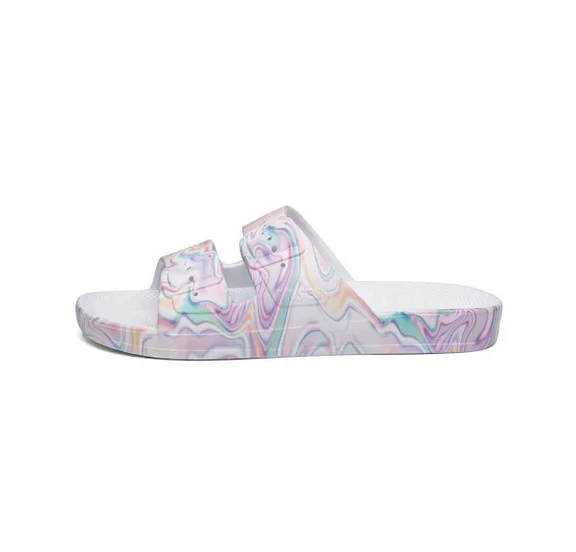 At Freedom Moses we’re all about celebrating summer 365 days a year. From am to pm, our YUMA WHITE vegan slides are injected with air so you feel like you’re walking on a cloud. Whether chilling at the beach or just hanging out, we’re also available for your whole crew, from kids slides to women’s slides and men’s slides, if you’re into prints, glitters, metallics or basic colors we’ve got you covered.