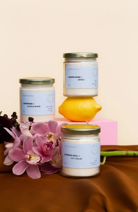 Homecoming uses all-natural soy wax, lead, and zinc-free cotton wicks, and a blend of premium essential and phthalate-free fragrance oils. Our soy candles are 100% vegan, cruelty-free, and free of petroleum and preservatives.