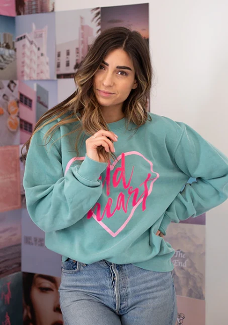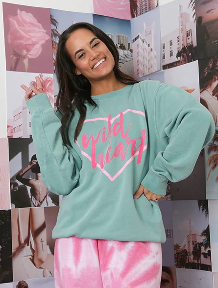Cotton/poly blend, oversized sweatshirt with Wild Heart printed graphic. This crewneck is pigment dyed and light weight for a vintage look/feel. Machine wash in cold (inside out) & hang to dry to minimize shrinkage & preserve graphic.
