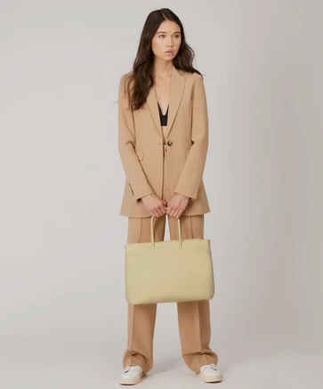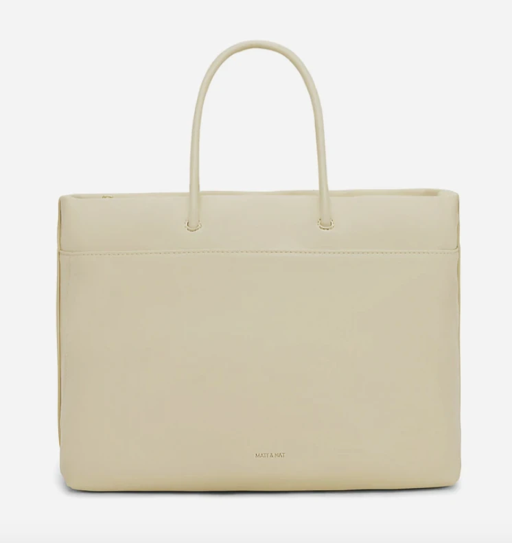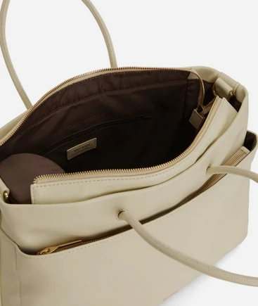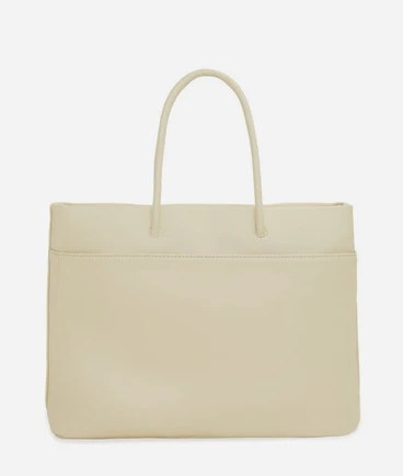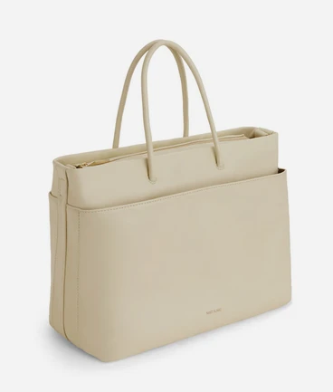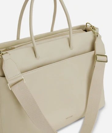 Diaper bag with tubular handles, zippered main compartment, front pocket with zip closure, back pocket with magnetic snap closure, and a detachable and adjustable webbing strap.