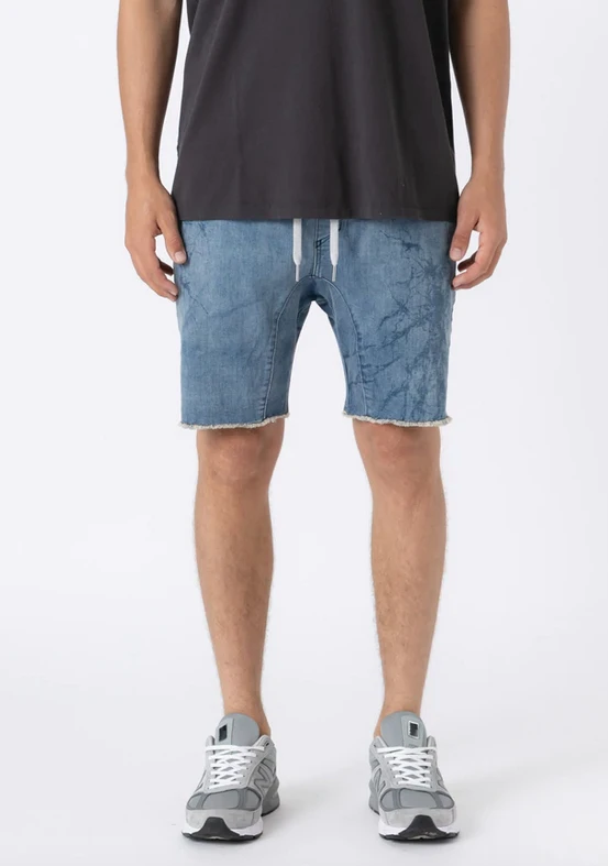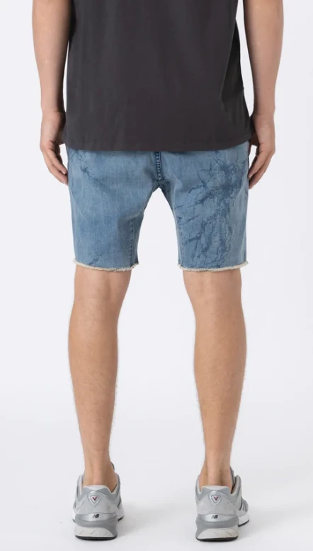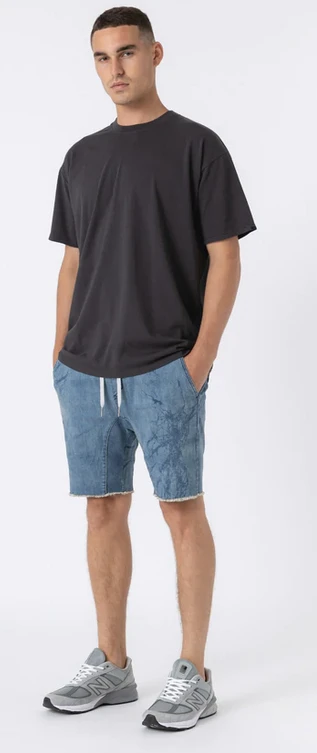 The ZANEROBE Sureshot Denim Short in Blue Marble – a relaxed stretch cotton twill chino short, comfortable and super easy to wear. We wear with our classic Box Tee.