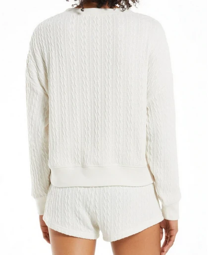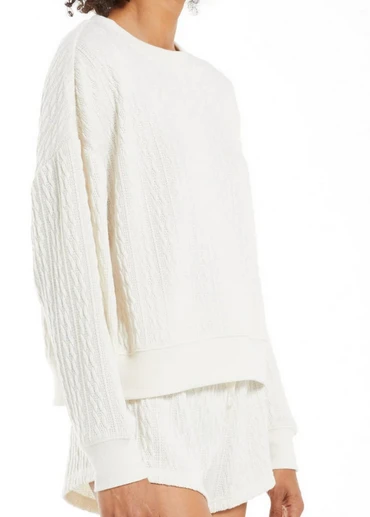 Z-Supply’s Downtime Cable Knit Set is the perfect loungewear addition! This set includes a long sleeved, relaxed fitting sweatshirt top, and shorts. Both the top and bottoms feature a cable knit style in the light colour, ‘bone’. Add on a pair of the Z-SUPPLY PLUSH SOCKSÂ to finish off your cozy Sunday outfit!